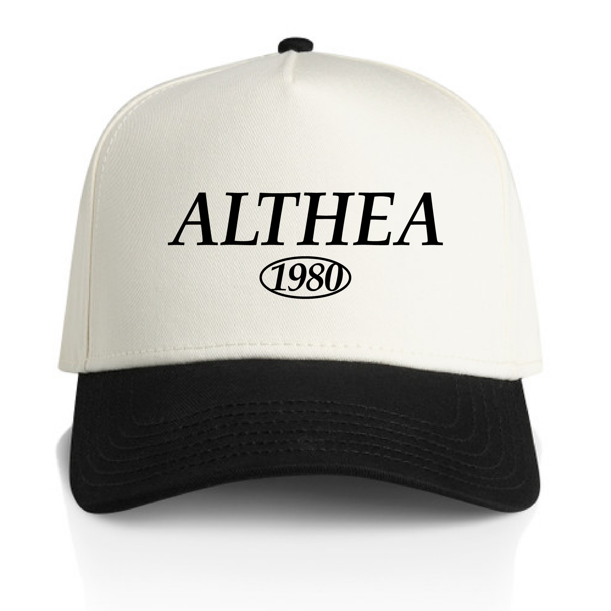 Embroidered logo on AS Colour Frame Two-Tone caps. These are 5-panel, high-profile, & structured. Fabric is 100% cotton with a practical plastic snapback closure.